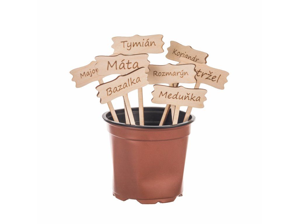 Drevené ceduľky s názvami bylín, ktoré perfektne padnú do záhona i kvetináča. Ceduľky budú peknou dekoráciou a vy navyše bylinky vždy s istotou rozoznáte.