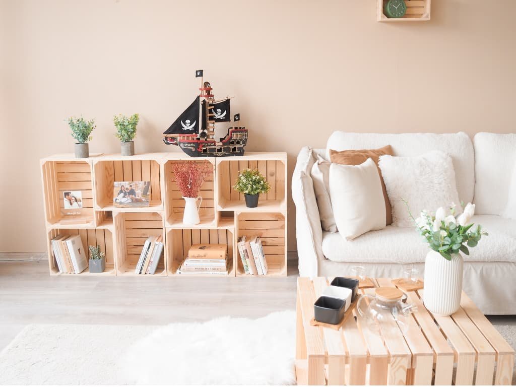Čerstvý a prírodný, taký je nábytok z drevených debničiek. Stena z drevených debničiek má rozmery 140x70x24 cm.