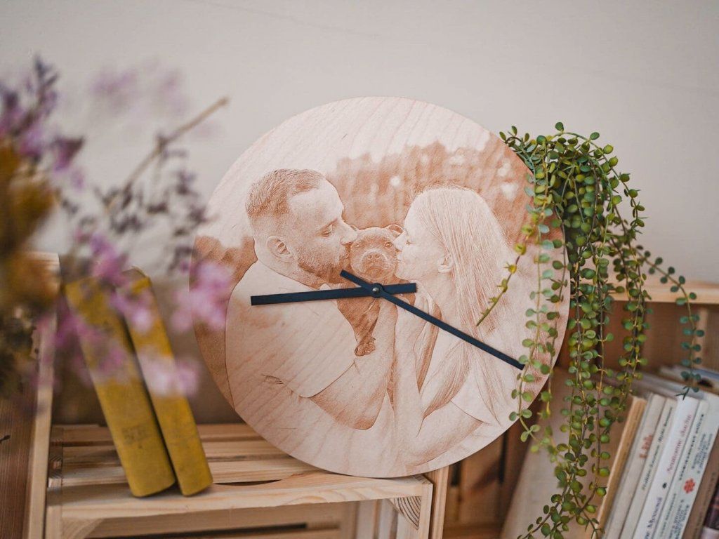 Drevené nástenné hodiny s gravírovanou fotografiou sú krásnym doplnkom interiéru. Svoju šťastnú spomienku budete mať stále na očiach a obyčajné hodiny sa premenia na skutočnú dekoráciu s vôňou dreva.