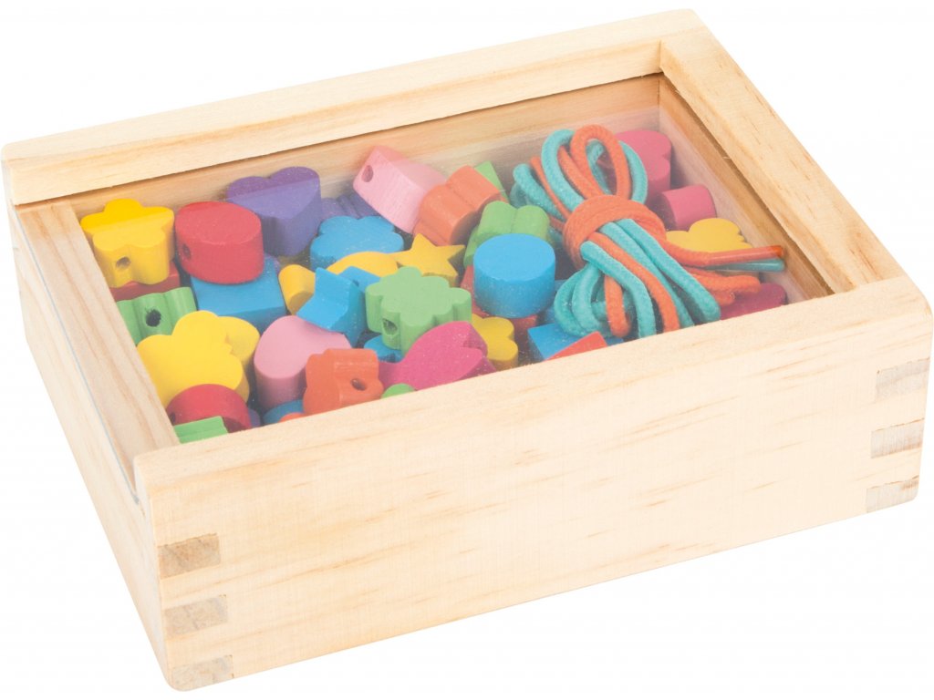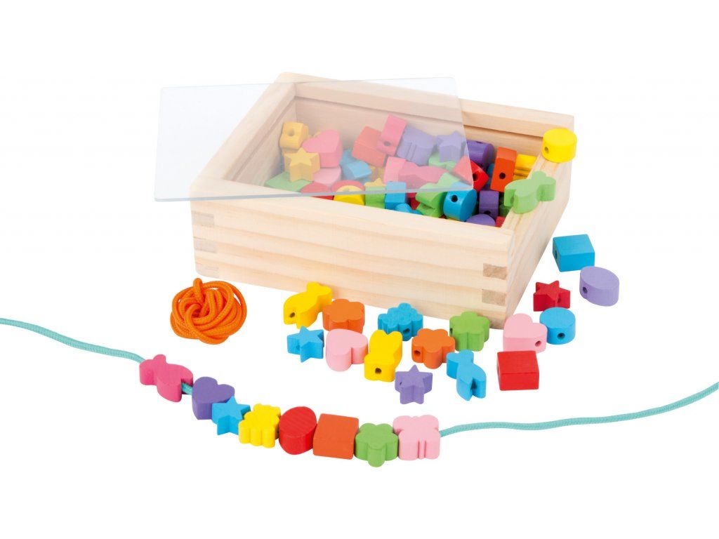 Drevená krabička s farebnými korálkami a šnúrkami je skvelou hračkou, ktorá deti poteší, zabaví a pritom podporuje koordináciu detských očí a rúk, rozvíja jemnú motoriku a podnecuje detskú predstavivosť.
