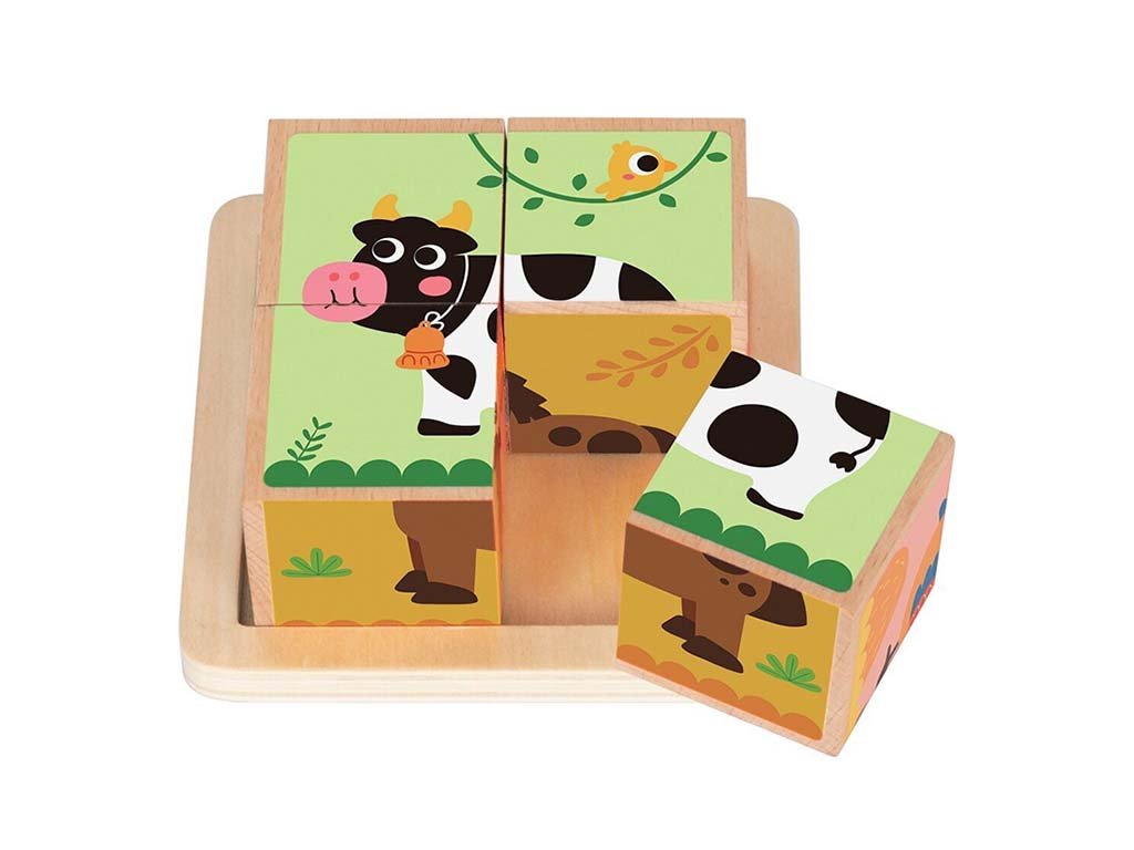Štyri drevené bloky vytvárajú šesť rôznych obrázkov zvierat. Veselé farebné ilustrácie hospodárskych zvierat si deti zamilujú a kocky sa rýchlo stanú obľúbenou hračkou.