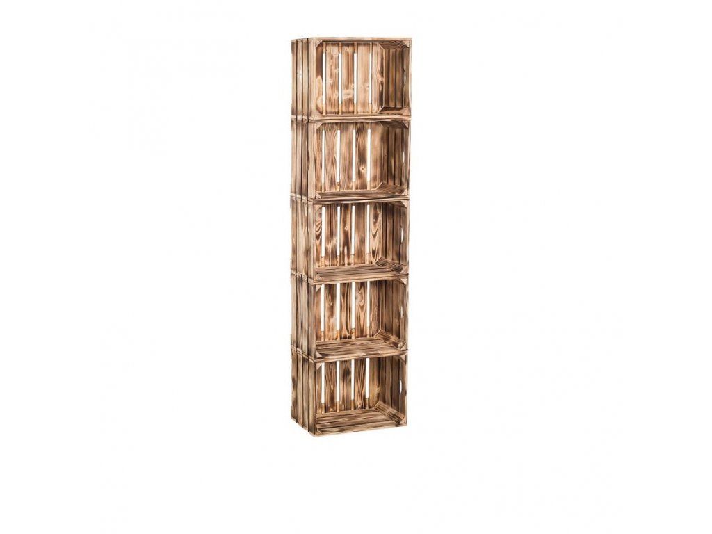 Štýlový regál z drevených debničiek v opálenom dizajne sa u vás doma stane originálnym kúskom. Regál je priestranný a pojme množstvo dekorácií aj kníh.