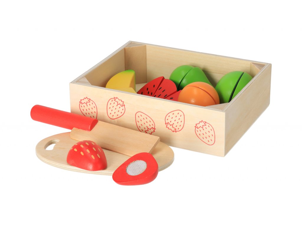 Drevená debnička plná pestrého ovocia, ktoré si deti môžu krájať a následne opäť spojovať pomocou suchého zipsu. Súčasťou balenia je drevený nôž a doska na krájanie.