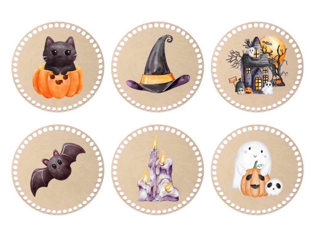 Šesť okrúhlych výrezov z brezovej preglejky s halloweenskym motívom sa hodí na výrobu štýlových podtáckov, ktoré rozžiaria váš interiér. V ponuke máme viac veľkostí a vhodné priadze u nás nájdete tiež.