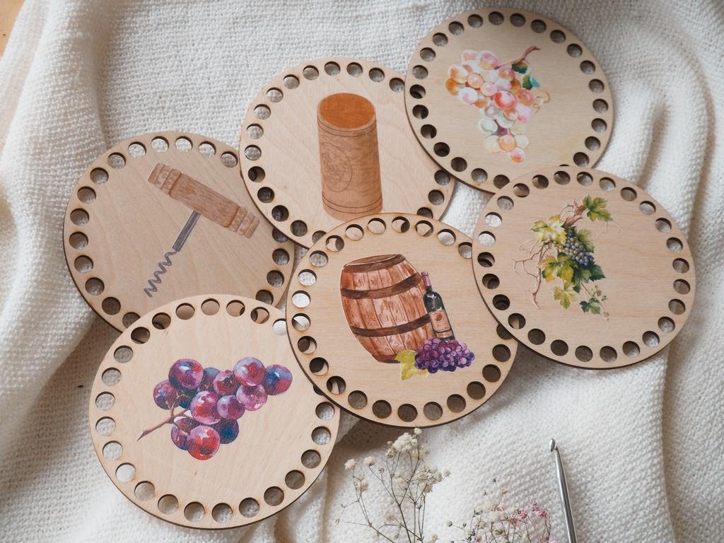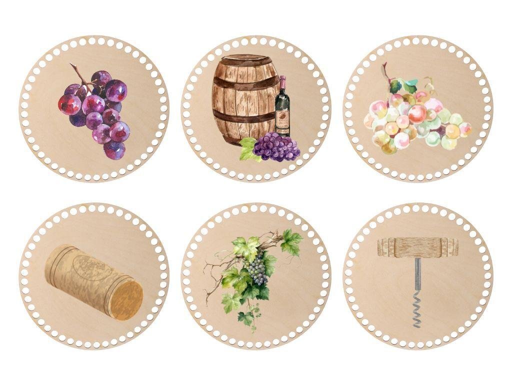 Šesť okrúhlych výrezov z brezovej preglejky s motívom vína sa hodí na výrobu štýlových podtáckov, ktoré rozžiaria váš interiér. V ponuke máme viac veľkostí a vhodné priadze u nás nájdete tiež.