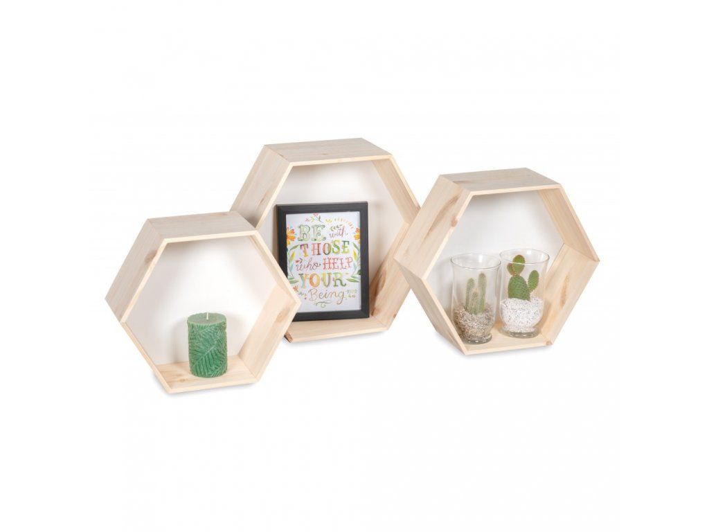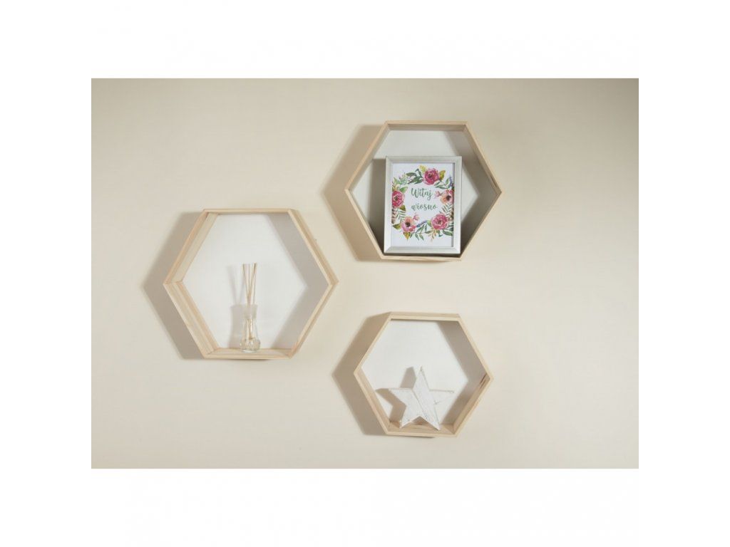 Sada 3 poličiek v tvare šesťuholníku ozdobí váš interiér.