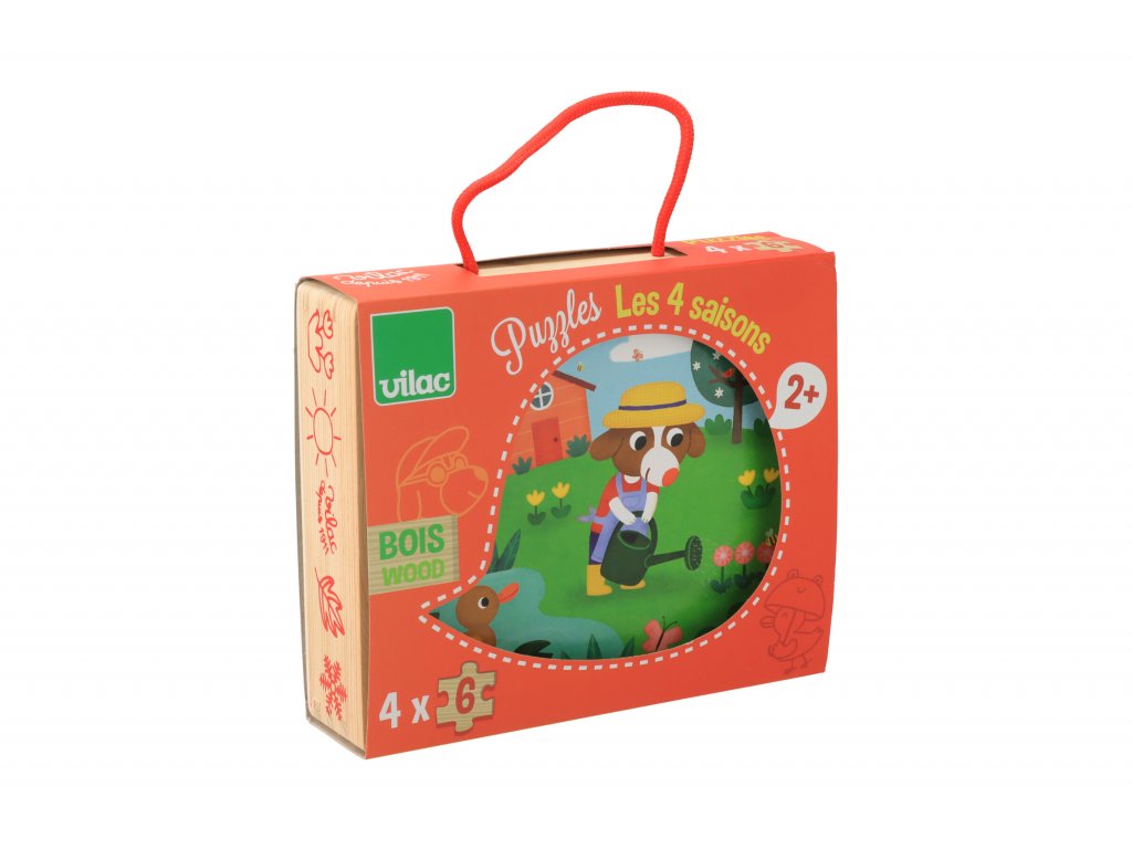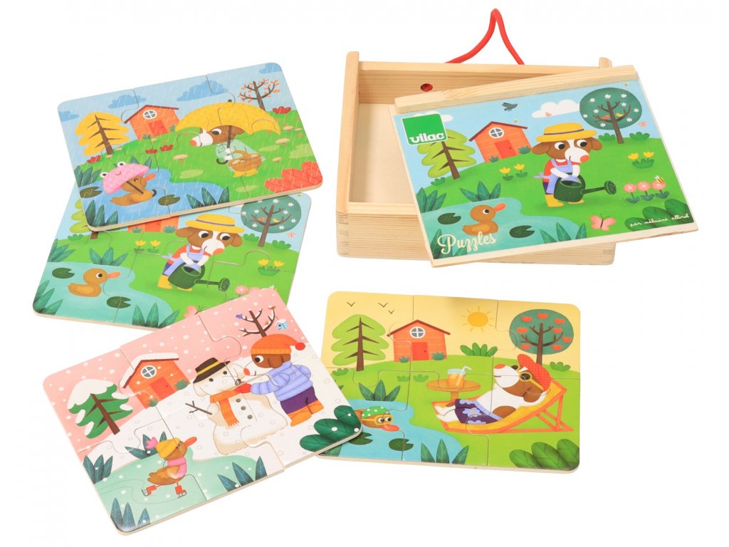 Krásne drevené puzzle pre vaše deti. Z 24 drevených dielikov zložíte 4 obrázky. Psík a jeho kamarátka kačička sú na obrázkoch v lete, na jar, na jeseň aj v zime.