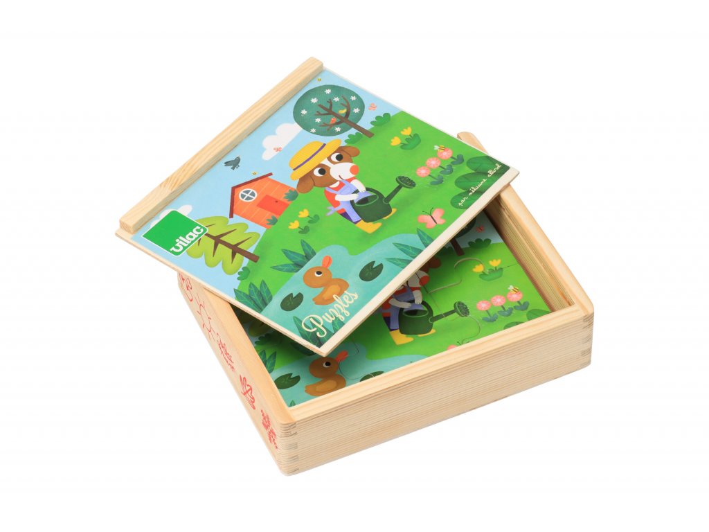 Krásne drevené puzzle so 4 obrázkami zobrazuje kačičku a psíka počas 4 ročných období. Vďaka veľkým dielom si skladanie užijú aj menšie deti.