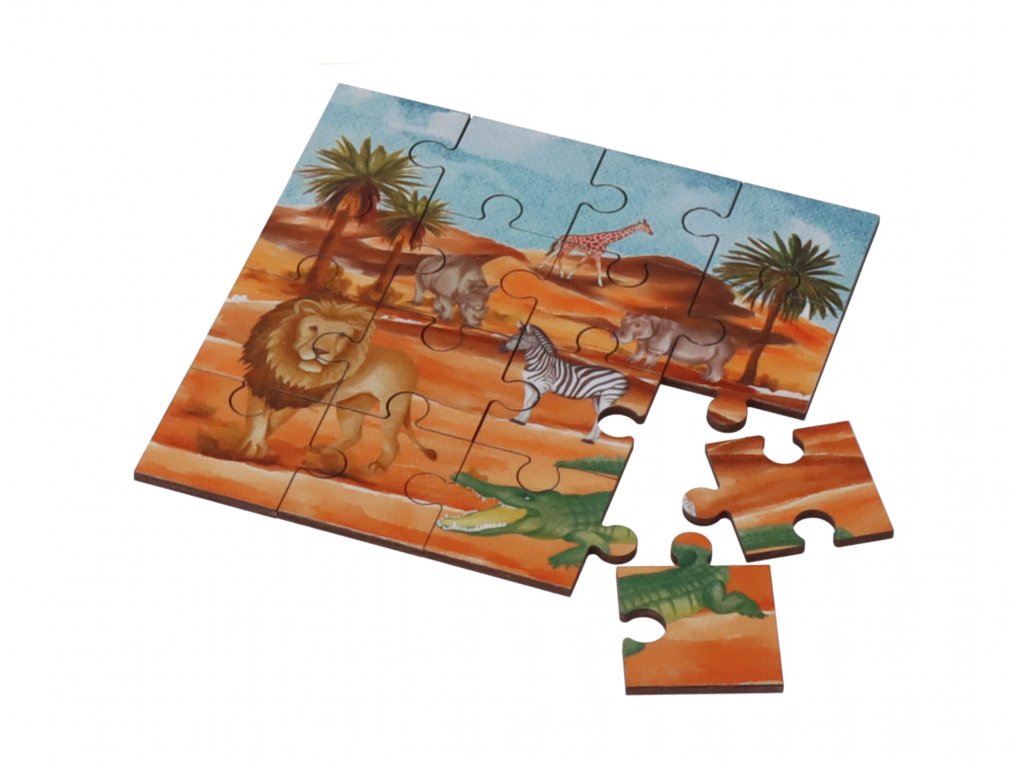 Puzzle s farebným obrázkom afrických zvierat potešia deti všetkých vekových kategórií. Skladanie drevených kociek pomáha rozvíjať jemnú motoriku, logické myslenie, ale aj trpezlivosť a spoluprácu.