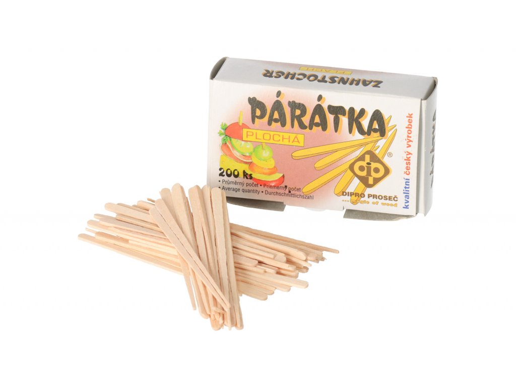 Drevené špáradlá vyrobené z brezy balené v papierovej krabičke obsahujúcej 200 ks.