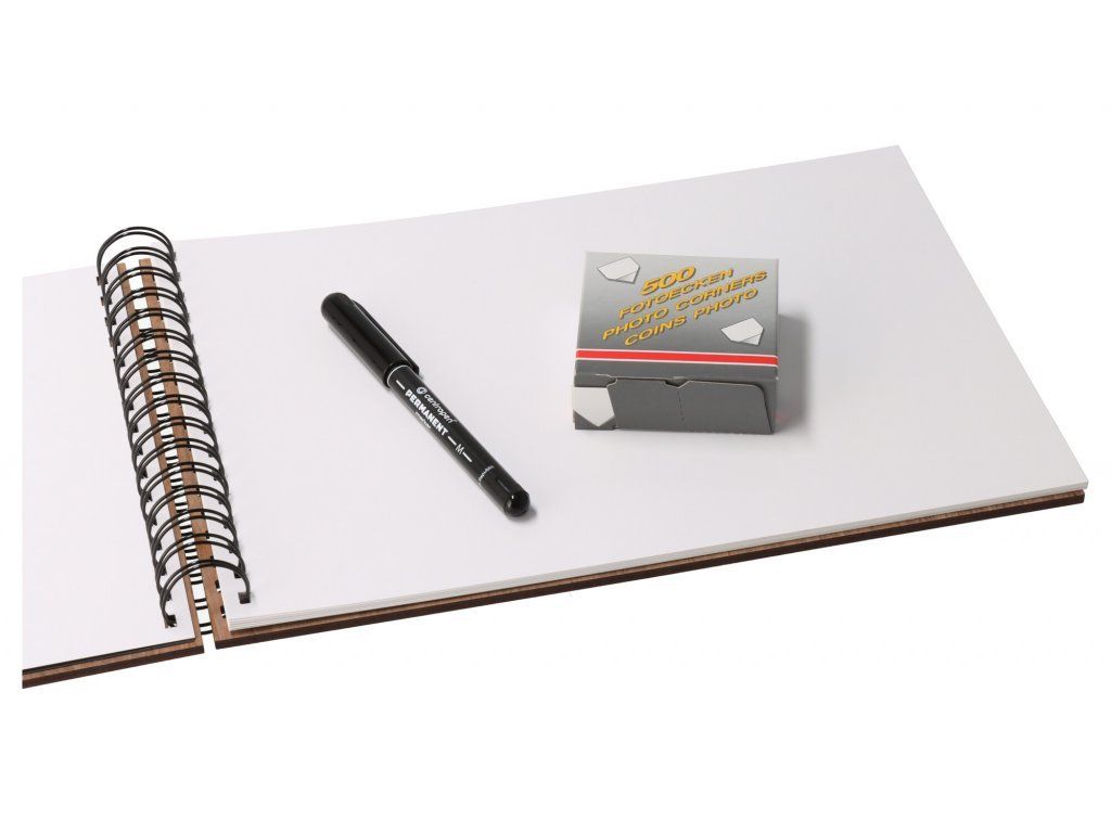 Drevené fotoalbum je zviazané pevnou čiernou krúžkovou väzbou, ktorá drží 25 tvrdých lesklých bielych listov veľkosti A4, stránky nie je možné pridať z dôvodu správneho zatvorenia. Prvá strana je vždy čierna a môžete ju použiť na odkazy, alebo svadobné verše, či citáty.