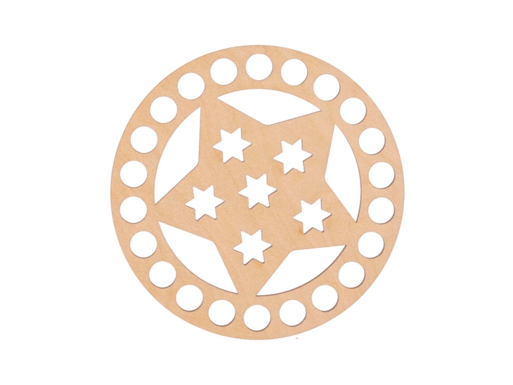 Okrúhle veko na košík s vyrezávaným motívom hviezdy je vyrobené z brezovej preglejky hrúbky 3 mm. Hodí sa na výrobu háčkovaných košíkov a organizérov zo špagátových priadzí. V ponuke nájdete rôzne veľkosti.