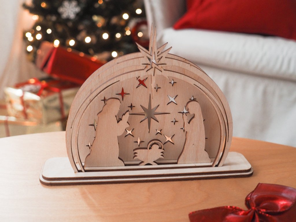 Vianočný betlehem z brezovej preglejky prinesie do vášho interiéru hrejivosť a sviatočnú atmosféru. Drobné detaily sú precízne vyrezané laserom a vďaka pevnému podstavcu môžete betlehem postaviť na okenný parapet, poličku alebo komodu.