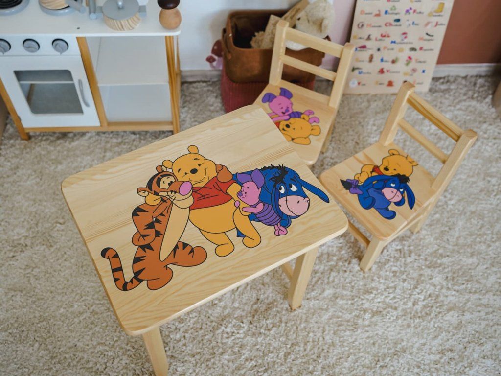 Drevený komplet stolíka a dvoch stoličiek s obľúbeným rozprávkovým motívom Macka Pú zaručene rozžiari detské oči a bude sa skvele vynímať nielen v detskej izbe.