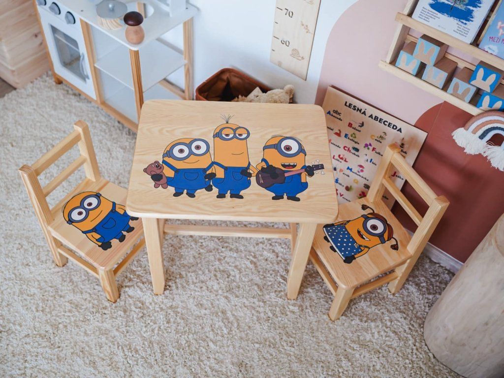 Drevená súprava stolíka a dvoch stoličiek s motívom veselých Mimoňov rozžiari detskú izbu a stane sa najobľúbenejším kúskom nábytku.