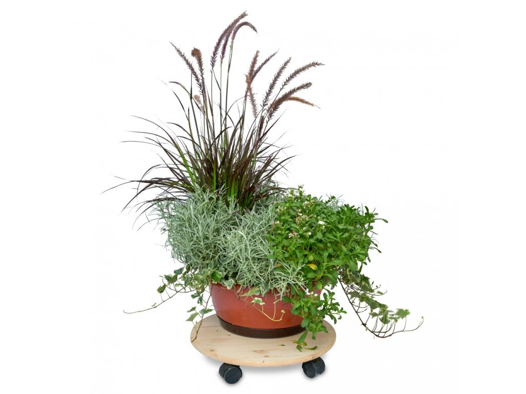 Drevený guľatý podstavec s kolieskami, na ktorý môžete umiestniť napríklad kvetiny a premiestňovať ich jednoducho z miesta na miesto.