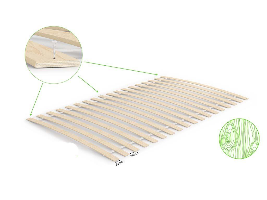 Lamelový rošt je vyrobený z prírodného materiálu, pri ktorom sa môžu vyskytnúť drobné farebné odlišnosti a iné prirodzené vlastnosti dreva.