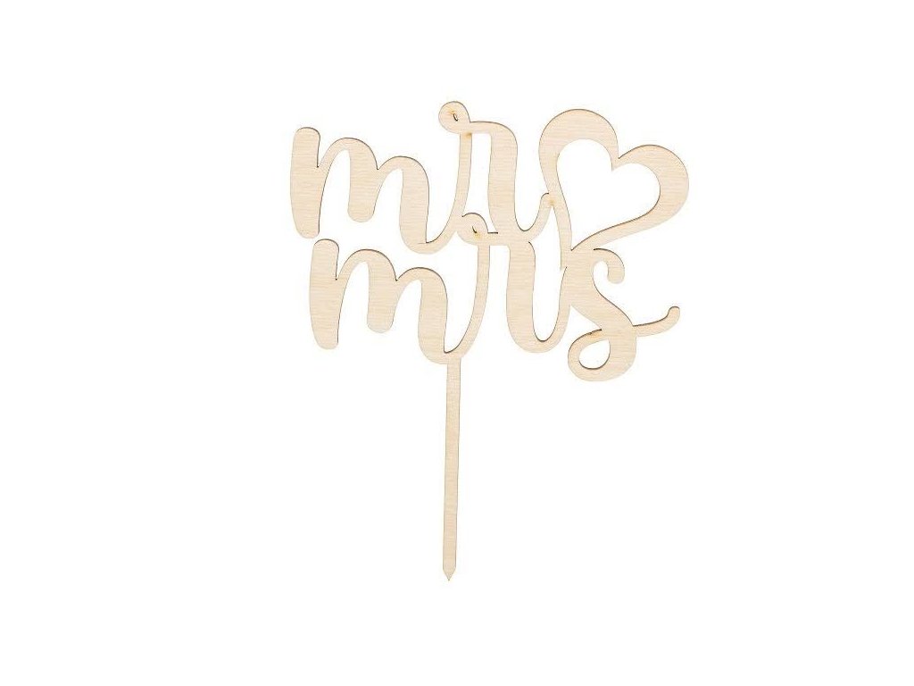Drevený ozdoba na zapichovanie s nápisom Mr ♡ Mrs. Výrobok je určený k dokončeniu alebo ako dekorácia.