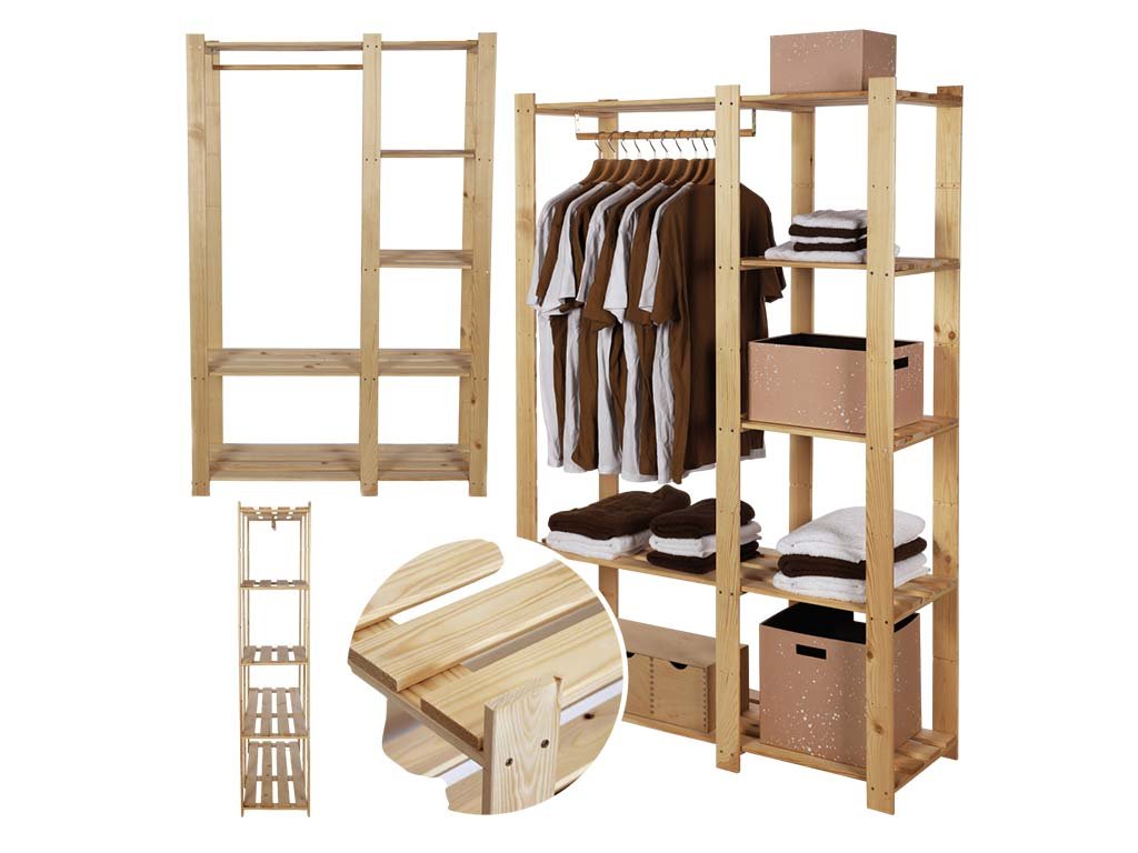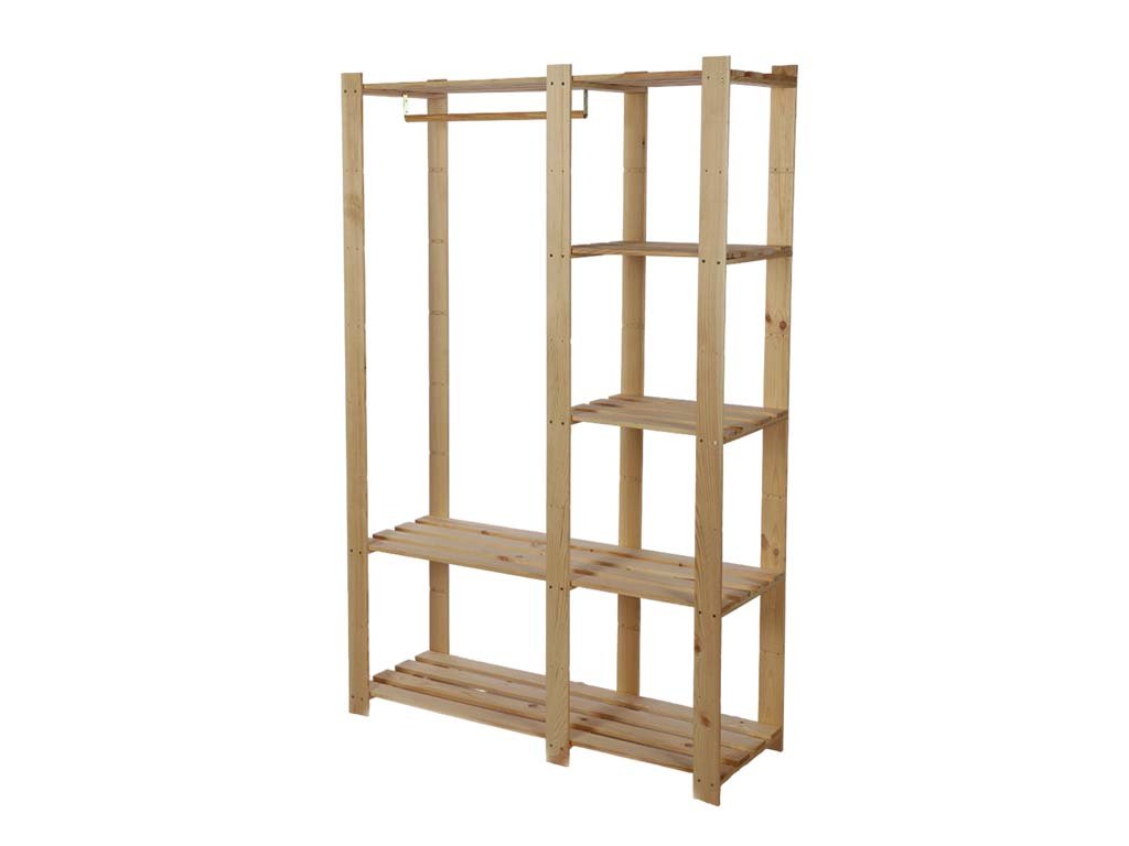 Šatníkový drevený regál ATMOWOOD z borovicového masívu je dokonalým úložným priestorom v domácnosti. Pripravené zárezy na konštrukcii umožňujú rôzne varianty upevnenia políc, máte tak možnosť získať šatník doslova na mieru.