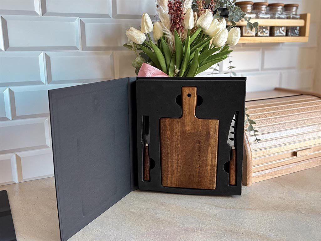 Stolujte štýlovo so setom na servírovanie syrov z kvalitného akáciového dreva. Tento elegantný set obsahuje doštičku s rúčkou, servírovaciu vidličku a nôž na syr. Všetko, čo potrebujete pre dokonalú prezentáciu svojich obľúbených pochúťok.