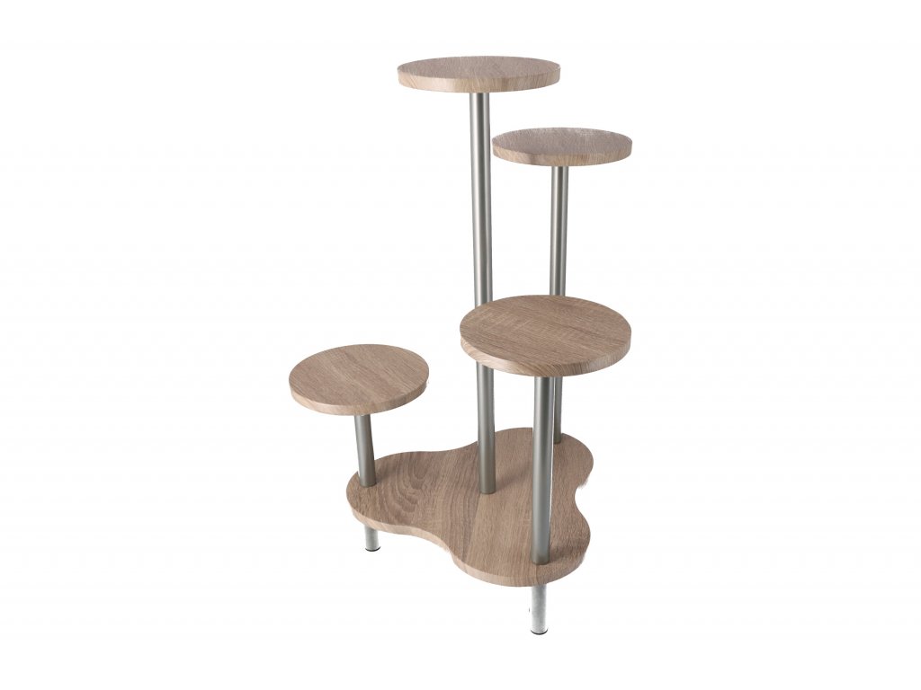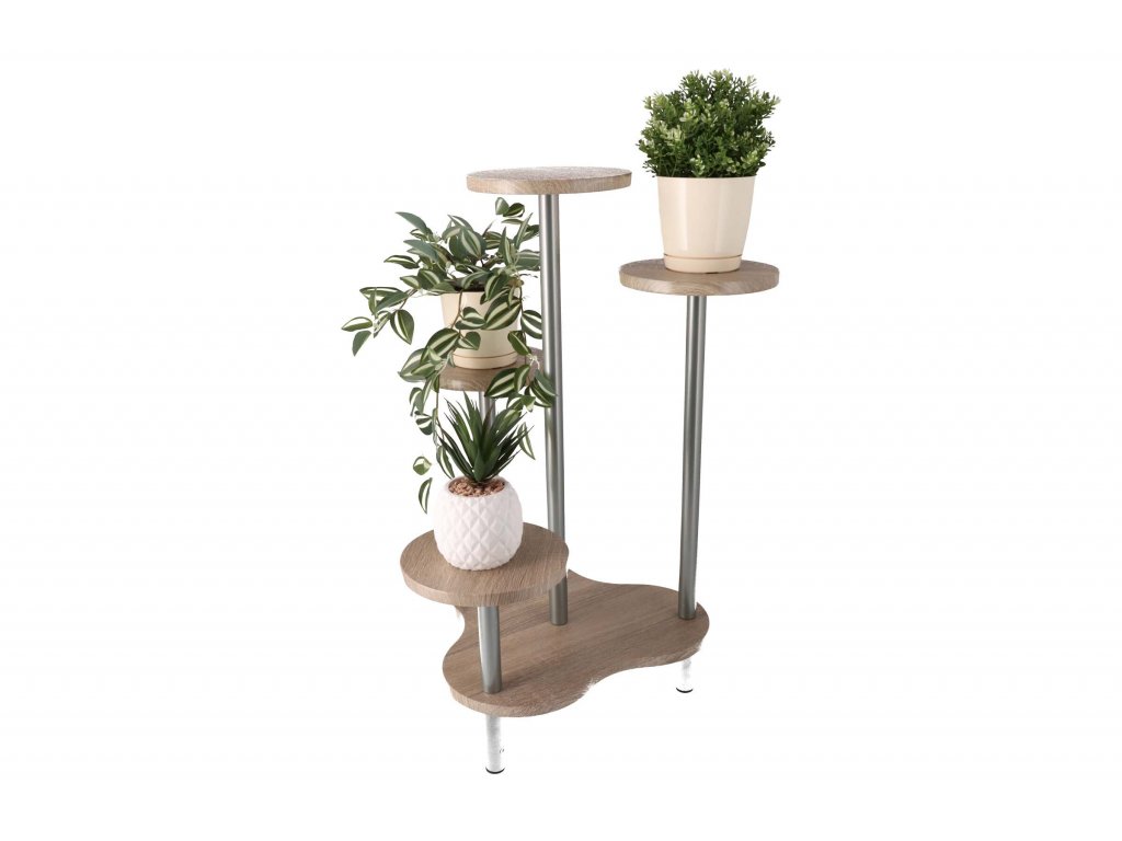 Kovová konštrukcia je vyrobená z hliníka, vďaka ktorému je stojan pevný a stabilný. Police sú vyrobené z FSC certifikovaných MDF dosiek, na povrchu je fólia v imitácii dreva (dekor dub). Jednotlivé podstavce unesú 4 kvetináče s maximálnym priemerom 20 cm, nosnosť jednej police je potom cca 5 kg.