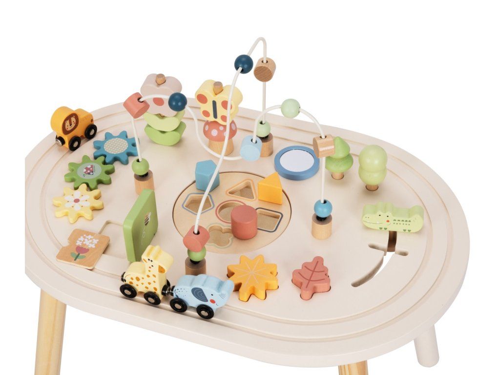 Stolík je vybavený rôznymi aktivitami, ktoré rozvíjajú jemnú motoriku, koordináciu ruka–oko aj logické myslenie. Deti môžu posúvať, otáčať, skladať aj skúmať jednotlivé prvky a učiť sa tak hravou formou princípom príčiny a následku. Každá časť stolíka ponúka iný typ zábavy, takže sa deti len tak neomrzia.