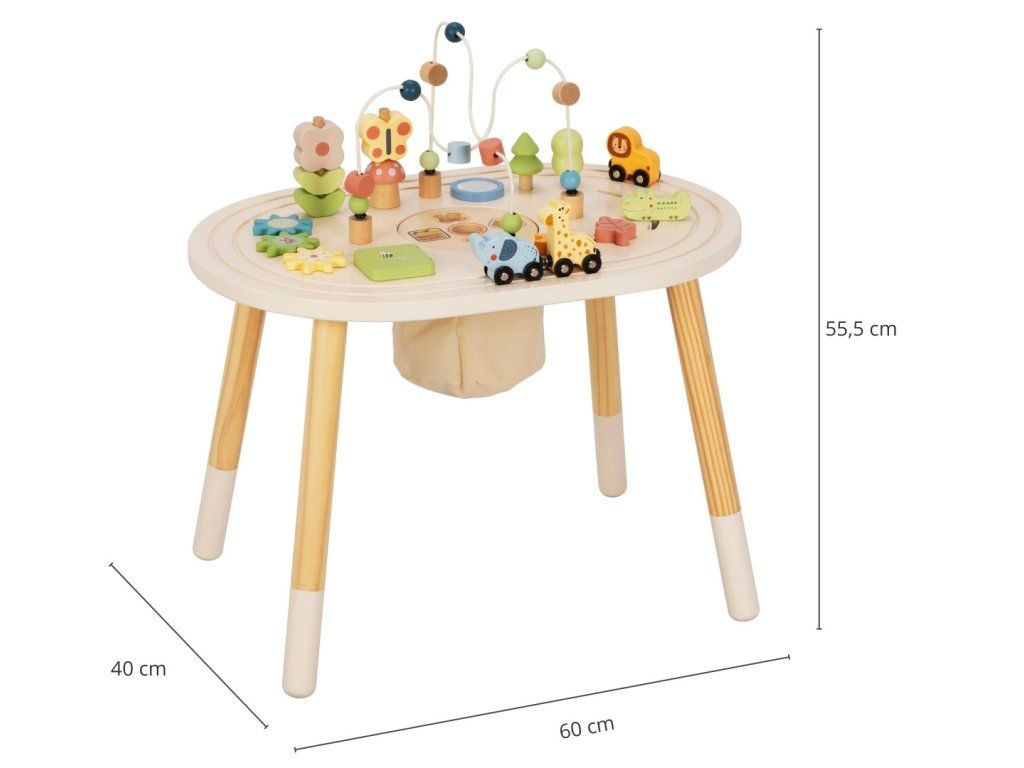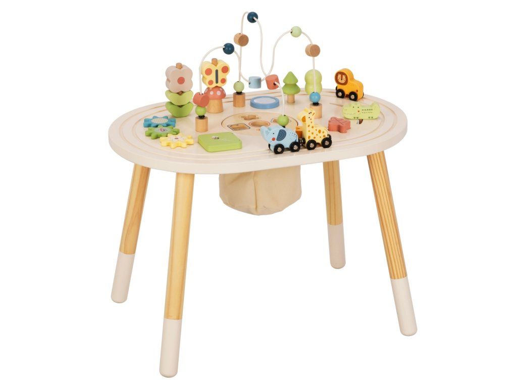 Doprajte deťom vlastné herné centrum plné objavovania. Drevený stolík s aktivitami ponúka pestrú škálu zábavných prvkov, ktoré deti zabavia a zároveň podporia ich prirodzený vývoj. Vďaka stabilnej konštrukcii a premyslenému dizajnu sa deti môžu hrať pohodlne v stoji a objavovať svet okolo seba z novej perspektívy.