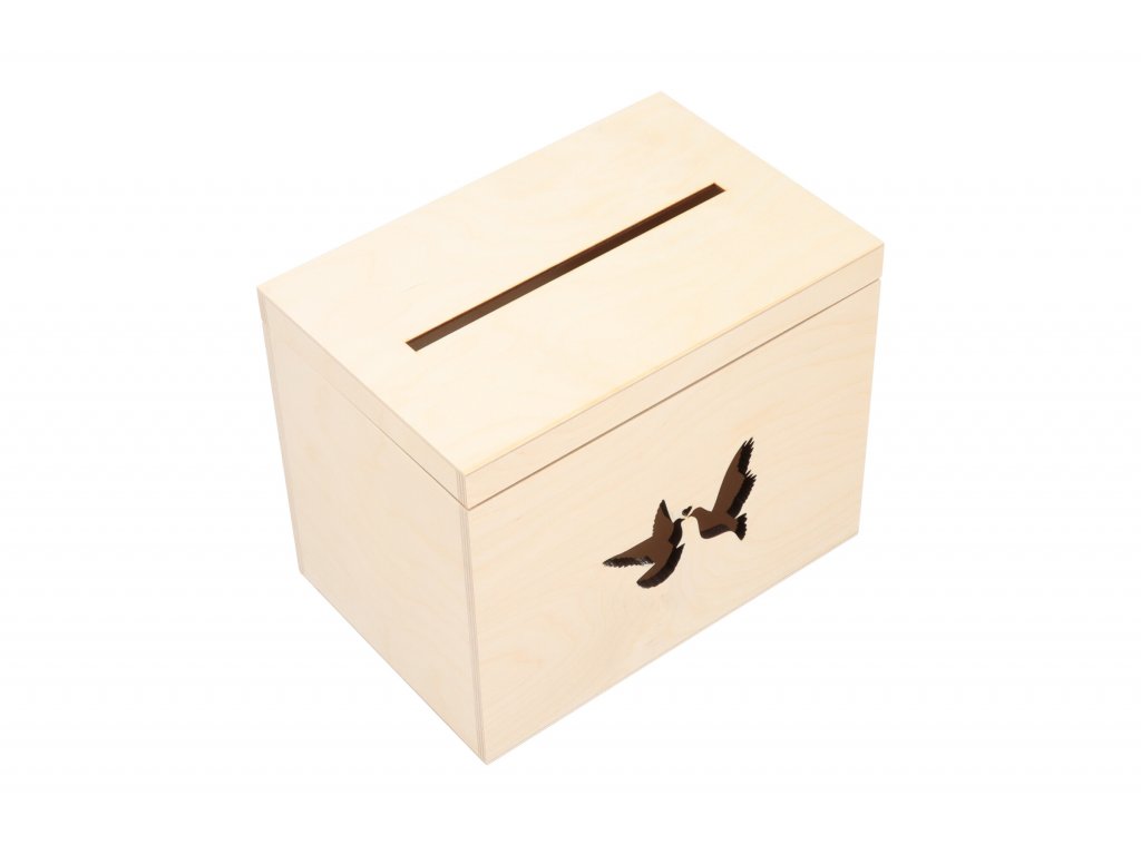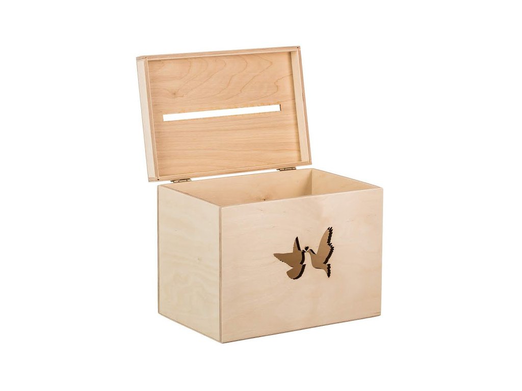 Drevený svadobný box sme na laseri ozdobili holubičkami, ktoré výrobku prepožičiavajú slávnostný charakter. Je vhodný na svadobné priania, ale aj peňažné dary a listy.