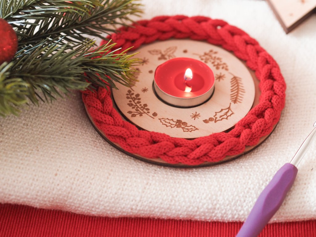 Okrúhly svietnik z brezovej preglejky bude originálnou vianočnou dekoráciou, stačí ho len obháčkovať vašou obľúbenou farebnou priadzou. Rozžiarte sviatočný interiér a pustite si domov tú pravú vianočnú atmosféru.
