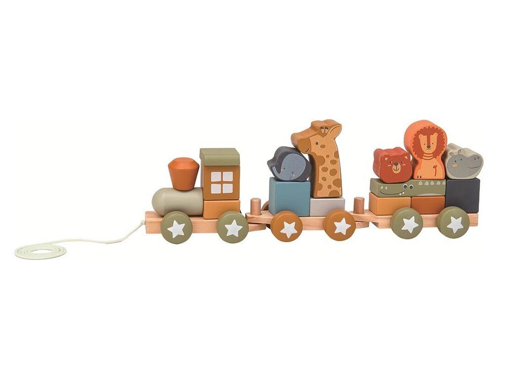 Drevený vláčik v krásnych farbách a niekoľko zvieracích pasažierov zabaví každé zvedavé dieťa. Skladacia lokomotíva je navyše skvelá na precvičovanie jemnej motoriky.