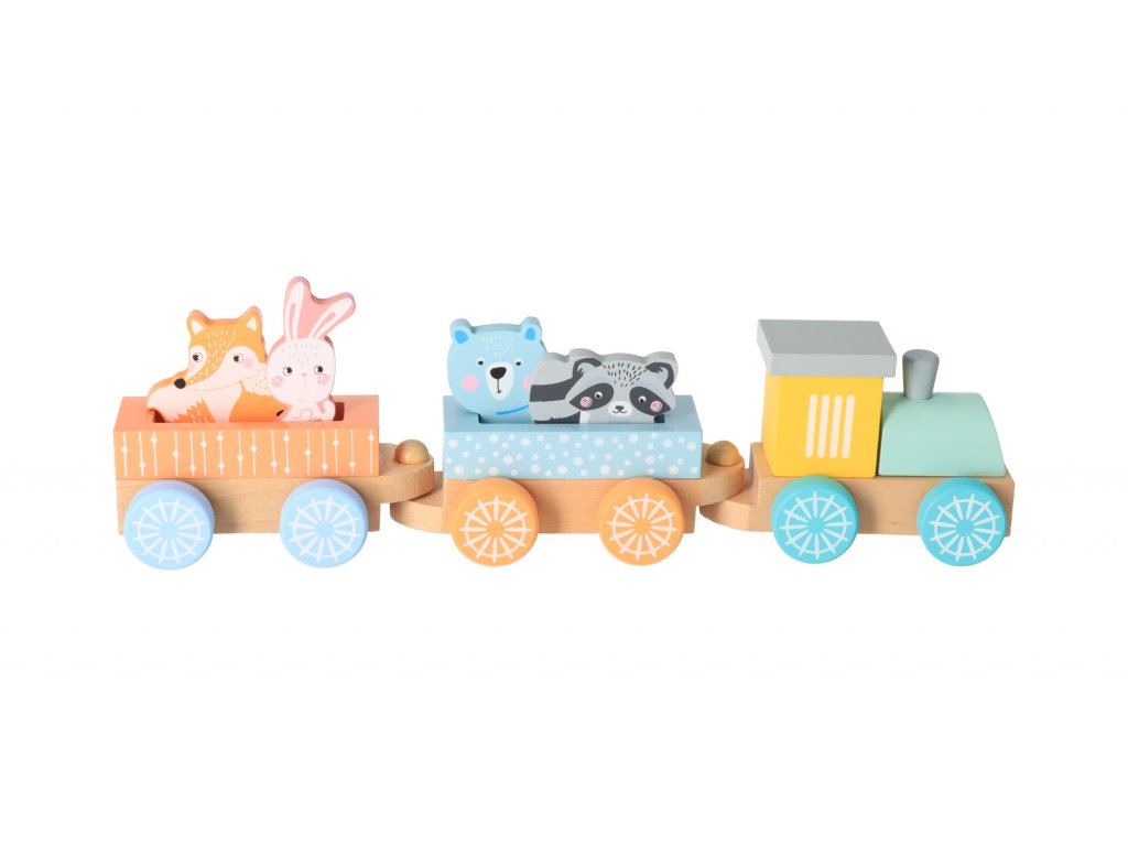 V sade nájdete 4 figúrky zvieratiek v jemných pastelových farbách. Na vagóne sa vezie líška, medvedík, zajačik a medvedík čistotný.