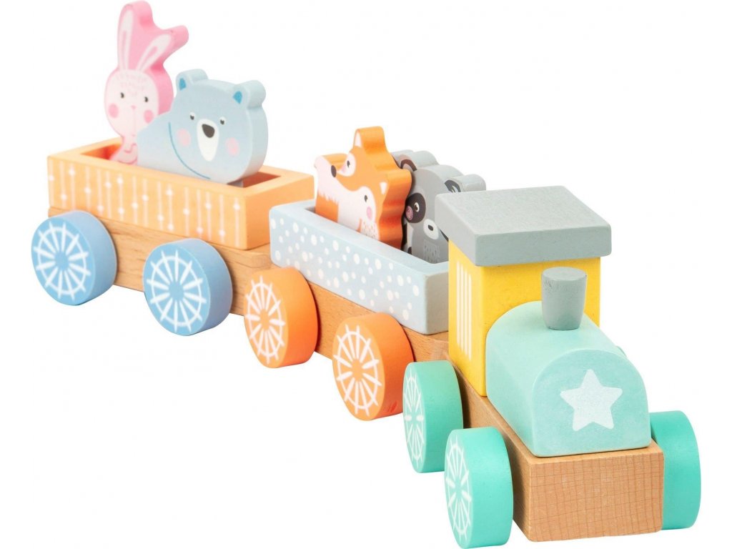 Krásna sada drevenej lokomotívy a vagónov vezúcich zvieratká by nemala chýbať v žiadnej detskej izbičke. Menšie deti si skladaním lokomotívy a pripájaním vagónov budú cvičiť jemnú motoriku a tie väčšie si môžu rozvíjať fantáziu vymýšľaním príbehov a zvieracích dobrodružstiev.