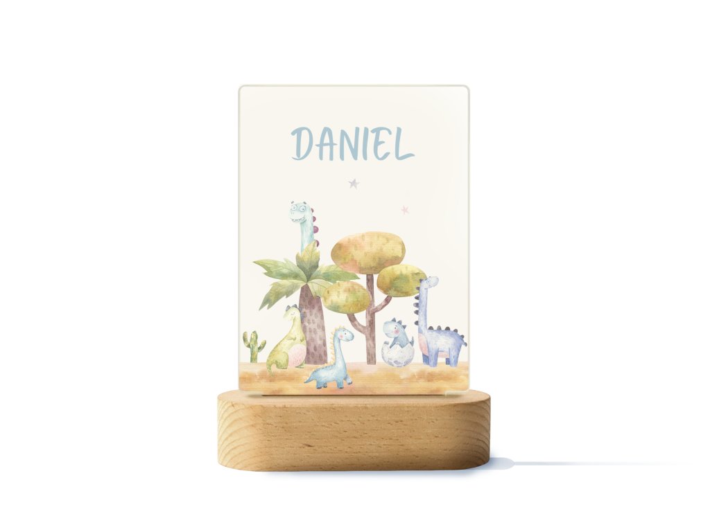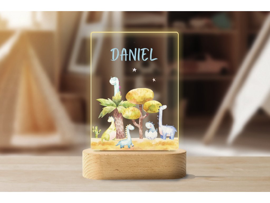 Akrylová LED lampa s farebným motívom dinosaurov je originálny doplnok do detskej izby. Veselý motív a tlačené meno rozžiaria nielen detské oči, ale aj krásne doladia interiér.