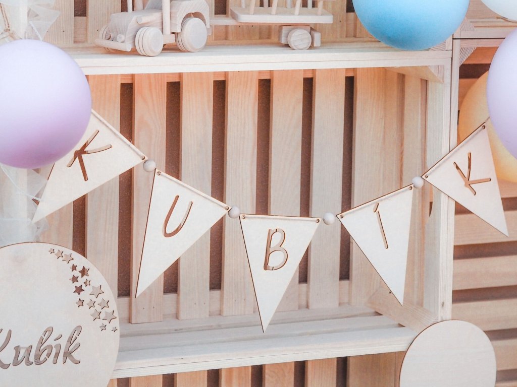 Krásna drevená girlanda bude ozdobou každej párty alebo štýlovým doplnkom v detskej izbičke. Je vyrobená z preglejky a môžete jej nechať prírodný vzhľad alebo dozdobiť podľa vlastnej fantázie.