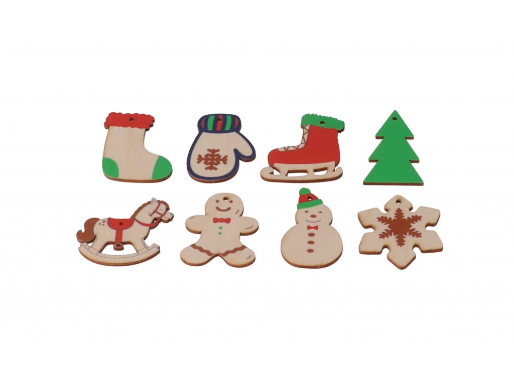 Kolekcia ôsmich kusov drevených vianočných ozdôb s obľúbenými zimnými motívmi rozžiari každý vianočný stromček, adventný veniec a v neposlednom rade oči vašich detí.