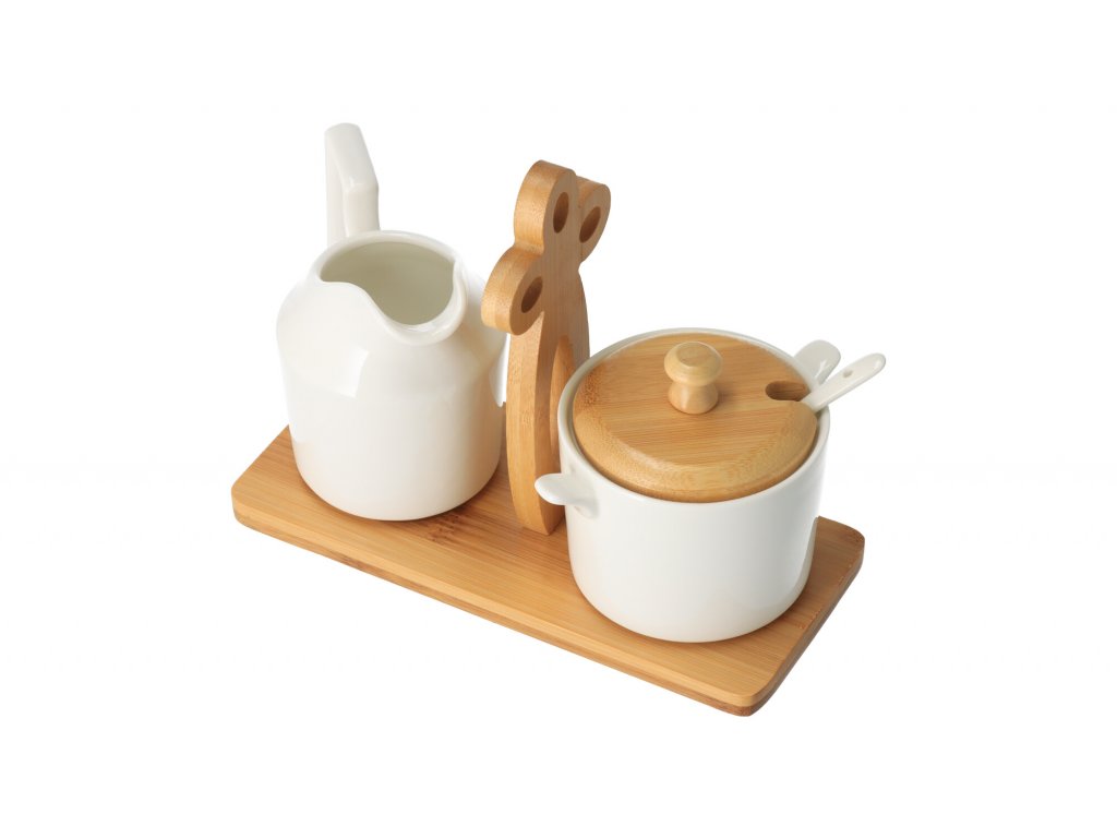 Elegantná súprava pocelanovej cukorničky a džbánku na mlieko na bambusovom stojane nájde využitie v každej modernej domácnosti. O vašich hostí bude postarané so štýlom.