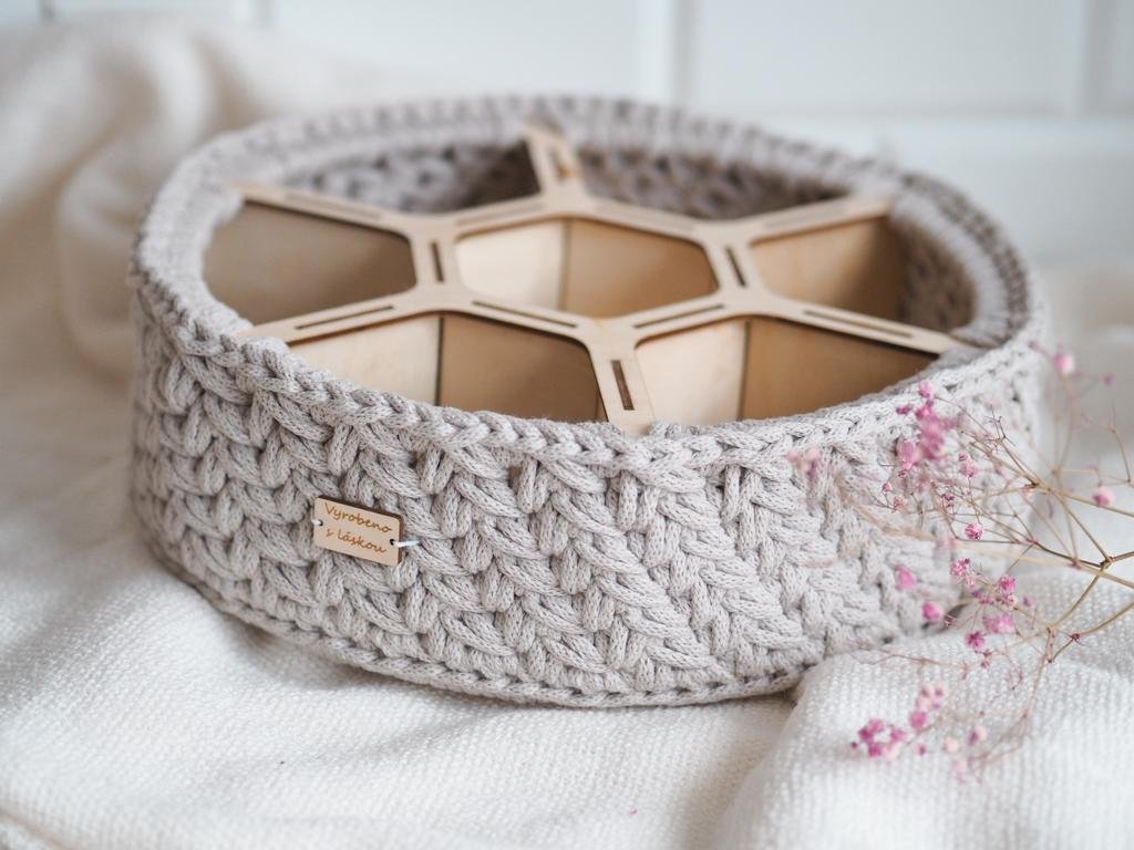 Konštrukcia z brezovej preglejky hrúbky 3 mm slúži ako základ pre háčkovaný organizér. Do priehradiek môžete uložiť čaje, kozmetiku, kancelárske potreby aj najrôznejšie drobnosti.