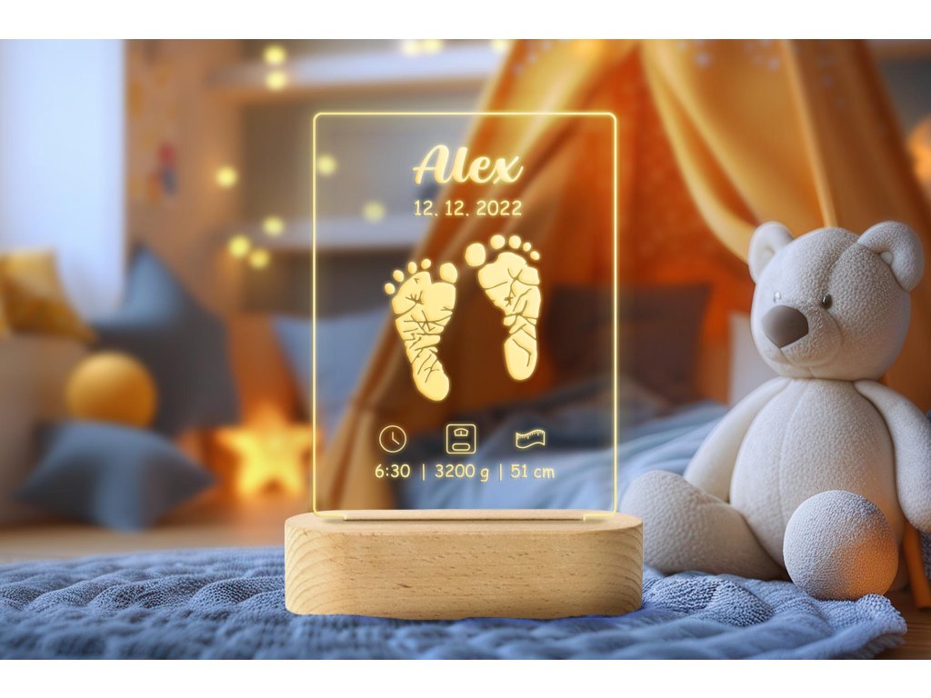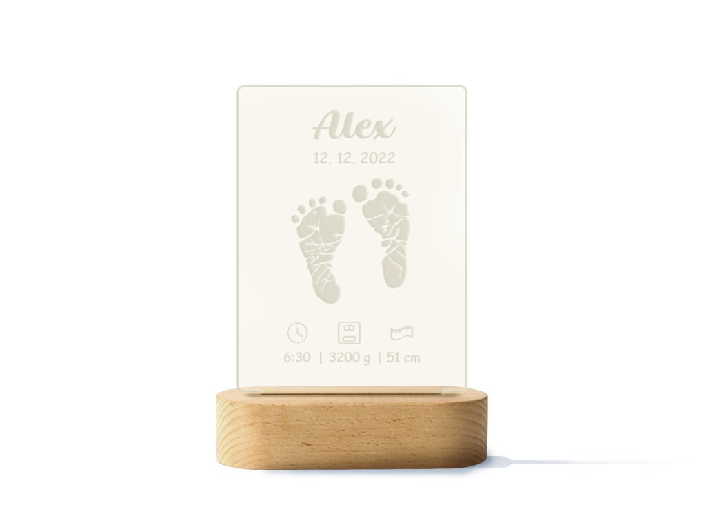Každé bábätko je jedinečné a originálne, jednu vec ale majú všetky spoločné - rastú veľmi rýchlo. Uchovajte si krásnu spomienku na narodenie vášho dieťatka v podobe jedinečnej personalizovanej dekorácie. Kombinácia akrylového skla a bukového stojana so zabudovanými LED svetlami rozžiari váš interiér a zaujme na prvý pohľad.