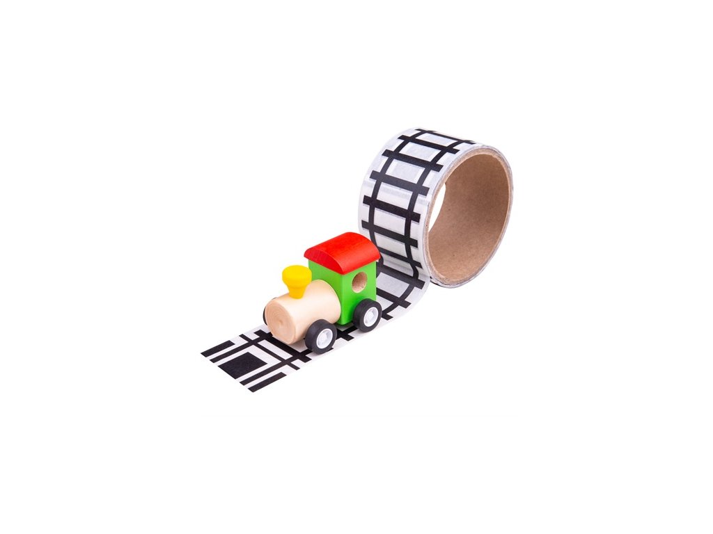 Vytvorte deťom vlakovú dráhu podľa ich priania. Súčasťou lepiacej pásky je aj drevená lokomotíva, s ktorou môžu malí dobrodruhovia cestovať zo stanice na stanicu.