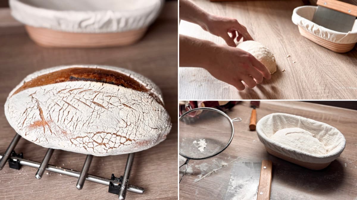 Pri príprave sme použili našu veľkú súpravu na pečenie chleba, ktorá obsahuje dve ošatky na kysnutie, metličku na cesto, žiletku, nerezovú stierku a všetko potrebné vybavenie – takže nemusíte zháňať nič navyše.