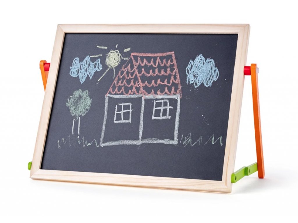 Z druhej strany je plocha na kreslenie suchou fixkou, ktorá je súčasťou dodávky, rovnako ako čistiaca hubka a farebné kriedy.