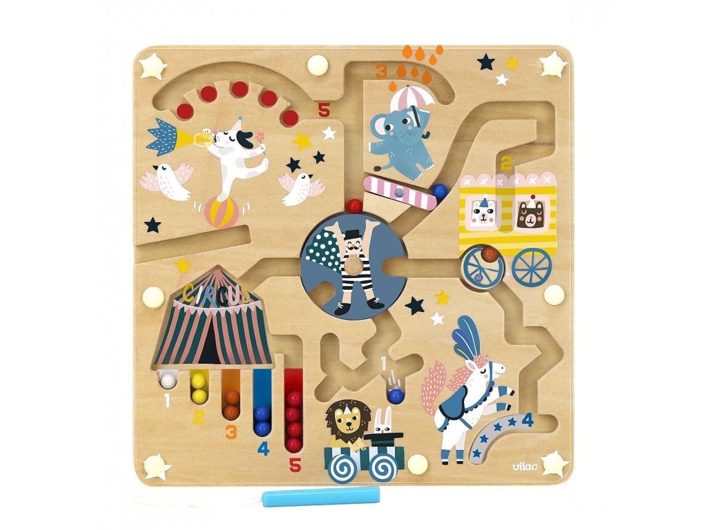 Deti cirkusy milujú! Drevený labyrint s magnetickými prvkami v krásnom farebnom prevedení pomôže malým ratolestiam rozvíjať jemnú motoriku a koncentráciu. Cestou do cieľa narazia na akrobata a rôzne cirkusové zvieratká.