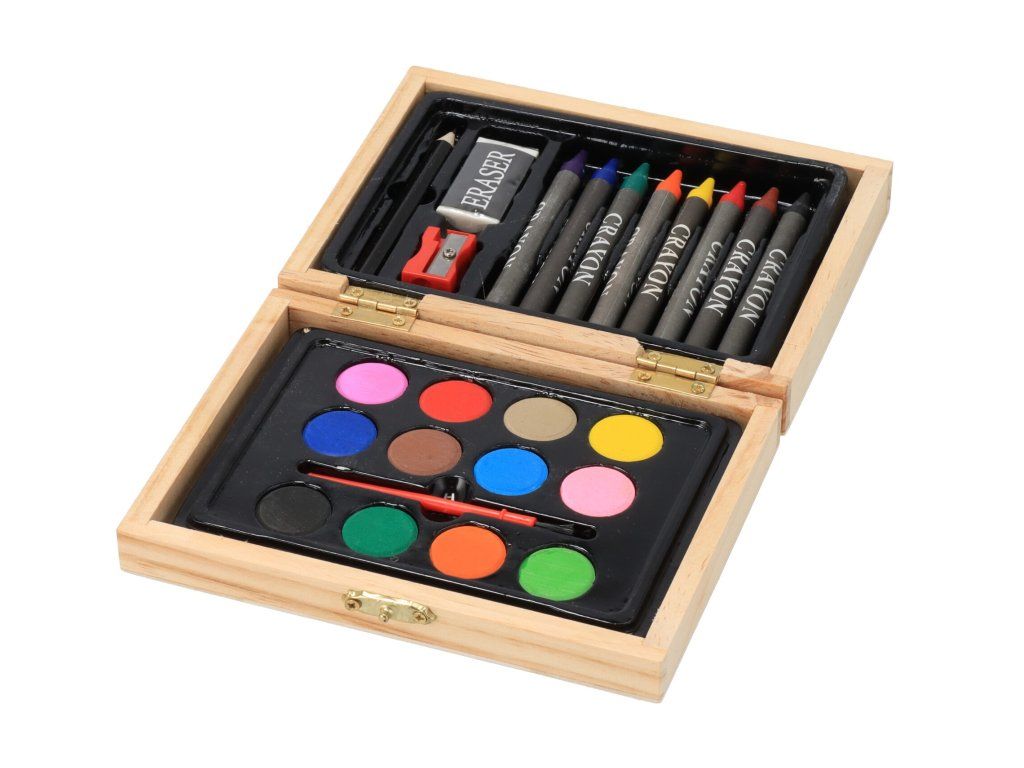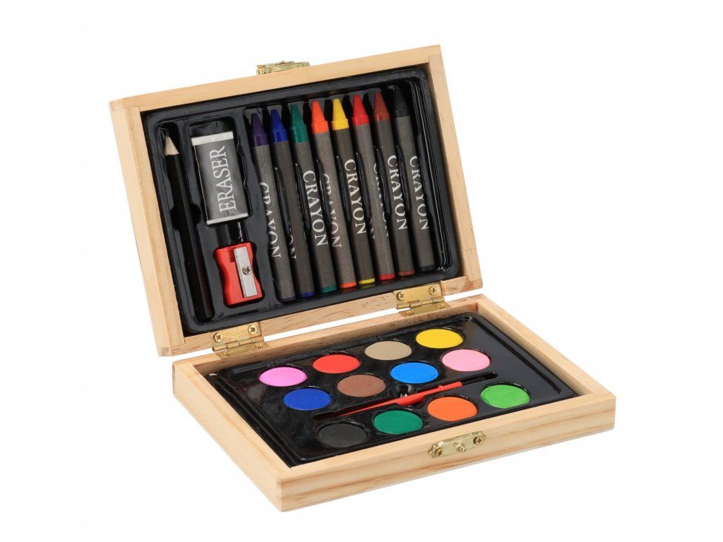 Maliarska súprava v drevenej krabičke ponúkne deťom všetko potrebné na rozvoj ich umeleckých zručností. Súprava obsahuje 8 voskoviek, 12 vodových farieb, štetec, ceruzku, strúhadlo a gumu.