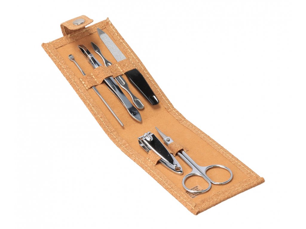 Manikúra v korkovom puzdre obsahuje všetko potrebné na každodennú starostlivosť o nechty. Súčasťou sady sú nožnice na nechty, nožnice na kožičku, šikmá pinzeta, obojstranný zatlačovač kožičky, lopatka a šikovný pilník na nechty.