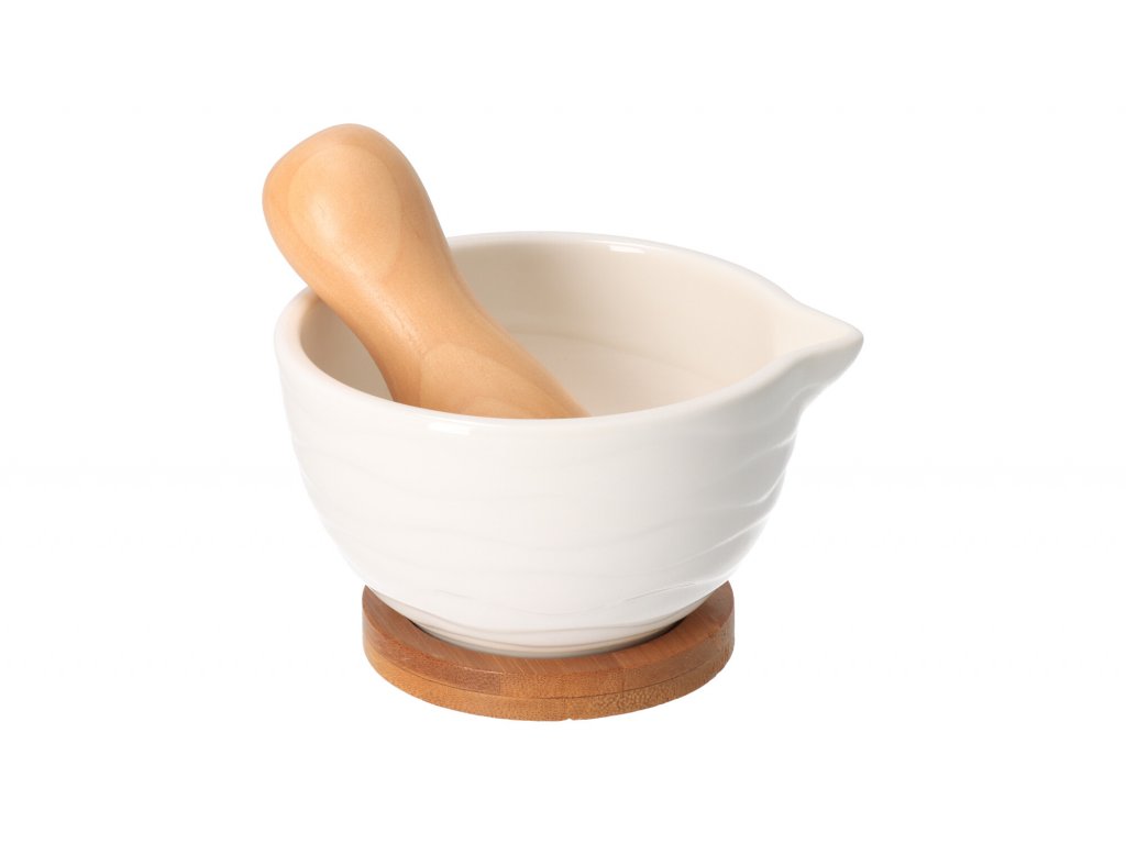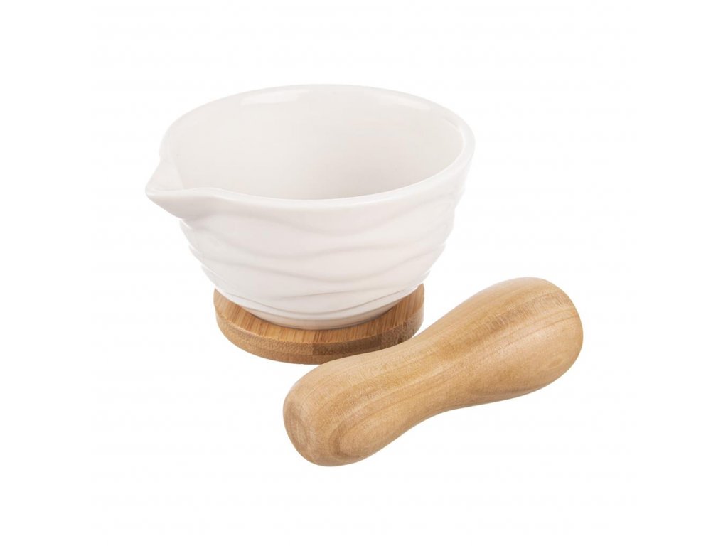 Mažiar vyrobený z porcelánu a bambusového dreva. Vhodný hlavne k drteniu byliniek, orechov a dochucovacích zmesí, ktoré dokonalo rozvinú svoju chuť.
