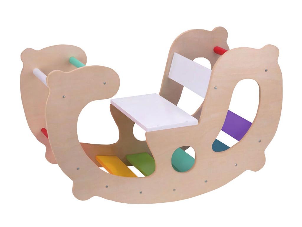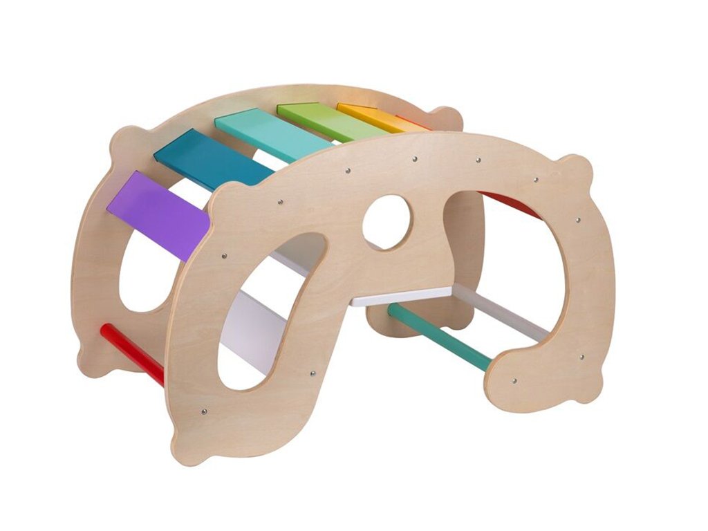 Drevená interiérová hojdačka 2 v 1 ponúka deťom množstvo zábavy. Montessori princípy, na ktorých je založená, podporujú učenie hravou formou. Môžu sa na nej nielen hojdať, ale pri obrátení sa hojdačka zmení na bezva dráhu. Deti tak môžu šplhať po dúhových rebrinách či hojdačku rôzne preliezať - tieto aktivity rozvíjajú motorické zručnosti, rovnováhu či koordináciu pohybu.