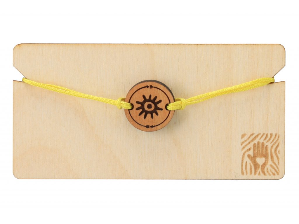 Náramok s vypáleným motívom slnka symbolizuje mužskú silu a znovuzrodenie. Uzlom na voskovanej šnúrke z nylonu môžete regulovať veľkosť náramku.