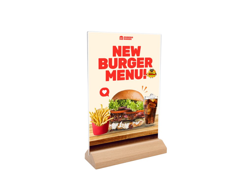Obojstranný stojan na menu formátu A5 dodá vášmu podniku profesionálny vzhľad. Tento praktický doplnok spája prírodné drevo a číry akryl, kombinácia vytvárajúca moderný a zároveň útulný dojem - ideálna pre reštaurácie, kaviarne, hotely, bary alebo recepcie.