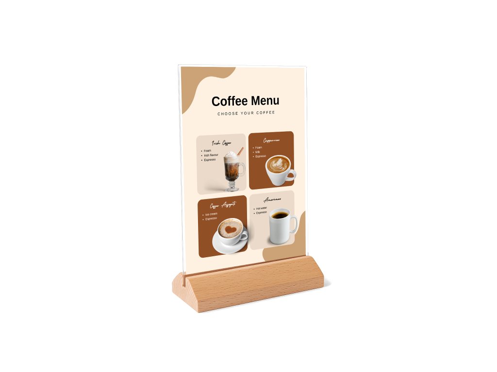 Drevená základňa je vyrobená z pevného masívu a vybrúsená do hladkého povrchu. Do nej sú zasadené dve priehľadné akrylové dosky, medzi ktoré sa ľahko vloží papier s vašim menu, nápojovým lístkom alebo informáciami pre zákazníkov. Akryl chráni vložený papier pred prachom, vlhkosťou a poškodením, pričom zachováva dokonale čistý vzhľad.