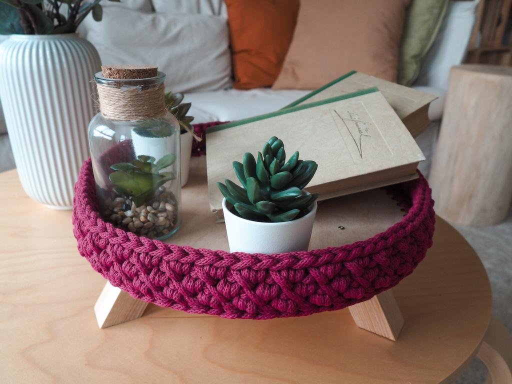 Drevený podstavec na kvety slúži na výrobu interiérovej dekorácie podľa vašich predstáv. Potrebovať budete iba háčik, priadzu Atmowood 5 mm v ľubovoľnej farbe a na dozdobenie ceduľku s textom na mieru alebo malý výrez z preglejky.